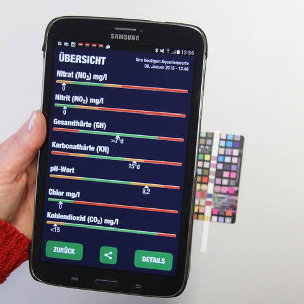- Wateranalyse en -diagnose per smartphone: Eenvoudige en betrouwbare controle van de waterwaarden van zoetwateraquaria. Bepaald: Gezamenlijke hardheid, carbonaathardheid, pH-waarde, nitriet, nitraat, chloor en CO2-gehalte