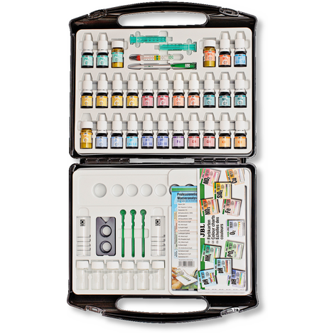 - Inhoud: 1 testkoffer voor alle zoetwateraquaria incl. 13 testen, 6 glazen cuvetten, 2 spuiten, 3 doseerlepels, thermometer, comparatorblok, 2 kunststof cuvetten, kleurenkaarten, CO2-tabel, balpen, protocolbladeren en gebruikershandleiding