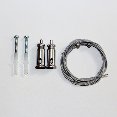- Inhoud: 2 pluggen & 2 schroeven met 2 speciale bevestigingen (voor plafond), 2x 150 cm rvs kabel