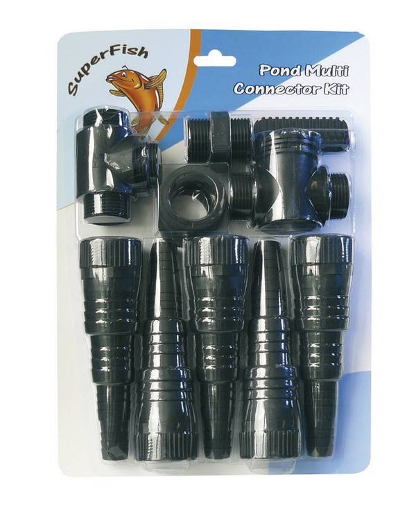 Complete set voor het aansluiten van vijverslangen, bestaande uit 5 Multi-step tules (Ø 20, 25, 32, 40 mm), O-ringen, koppelstuk, T-stuk en kraantje.