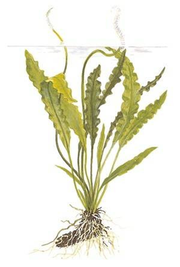 Aponogeton crispus uit Sri Lanka staat met zijn lichtgroene, golvende en transparante bladeren prachtig in elk aquarium. Bladeren van 25-50 cm en de plant wordt 15-25 cm breed.